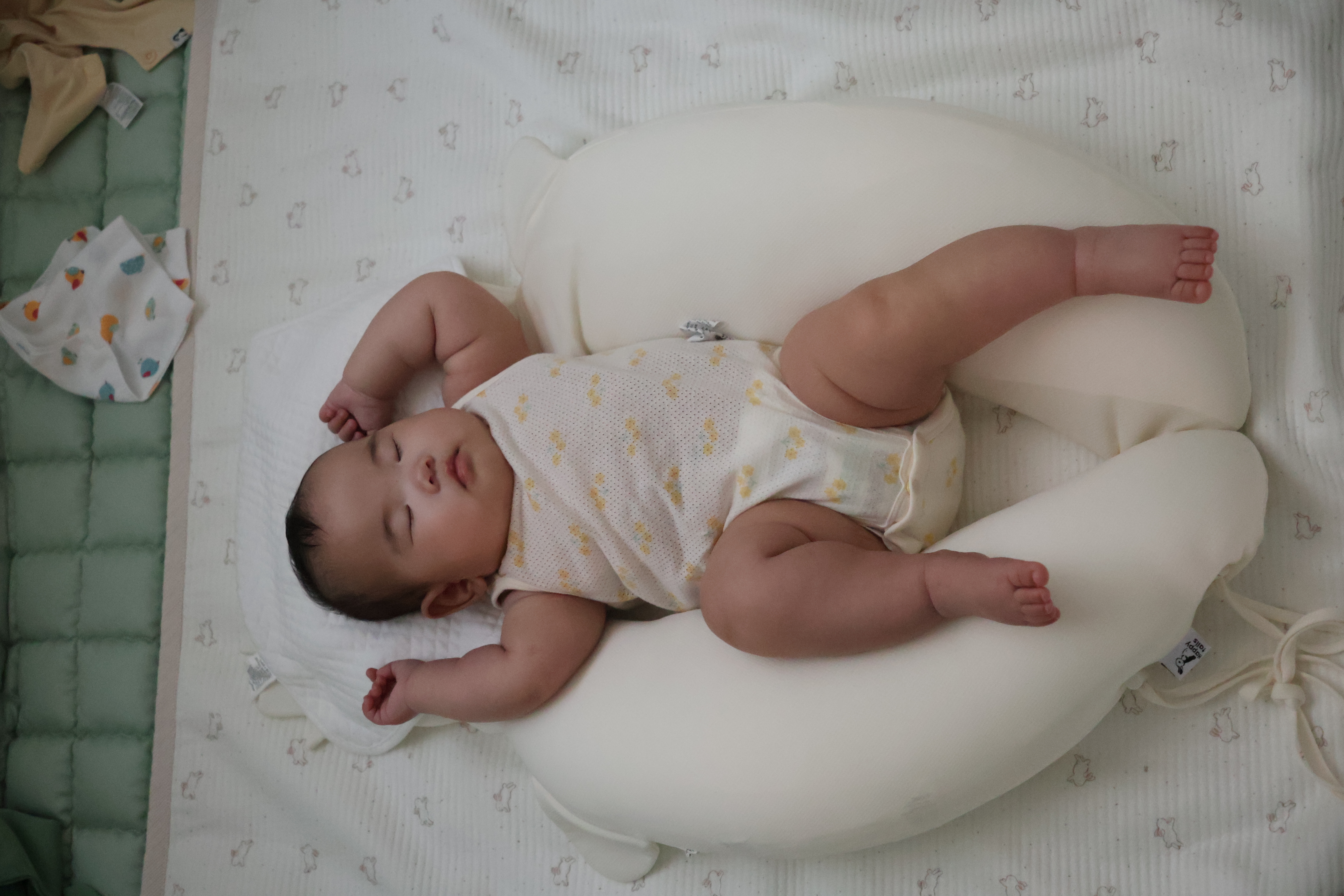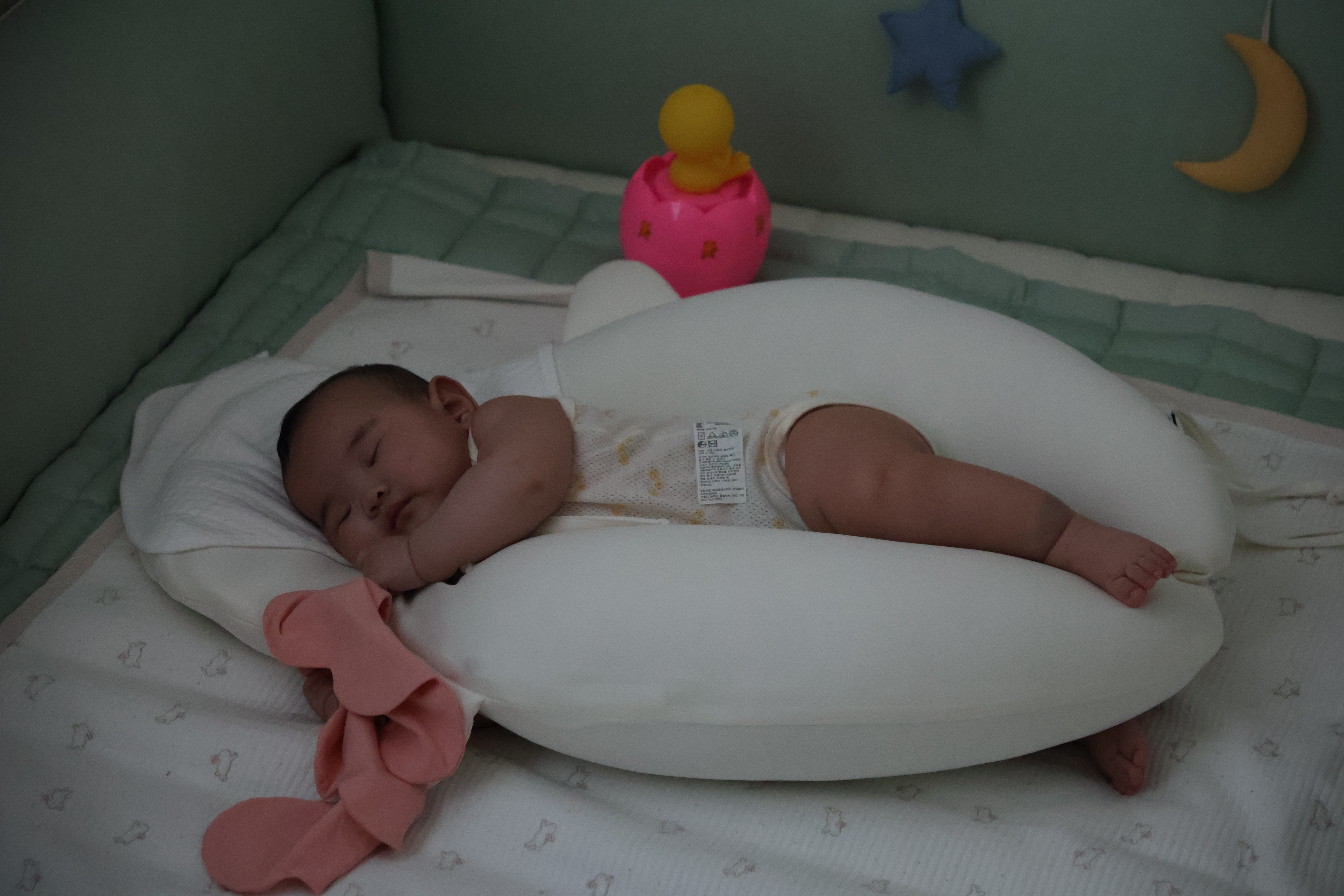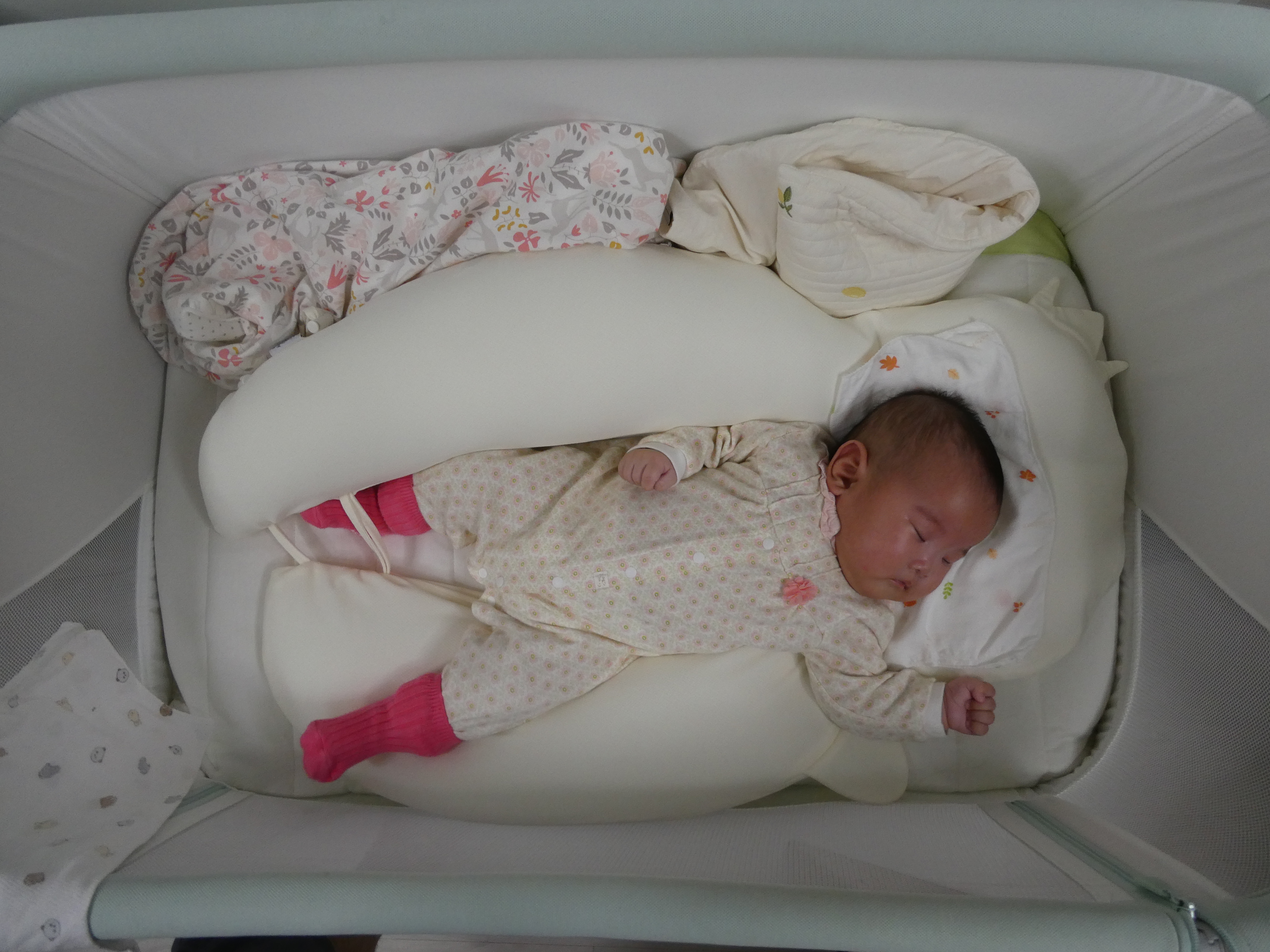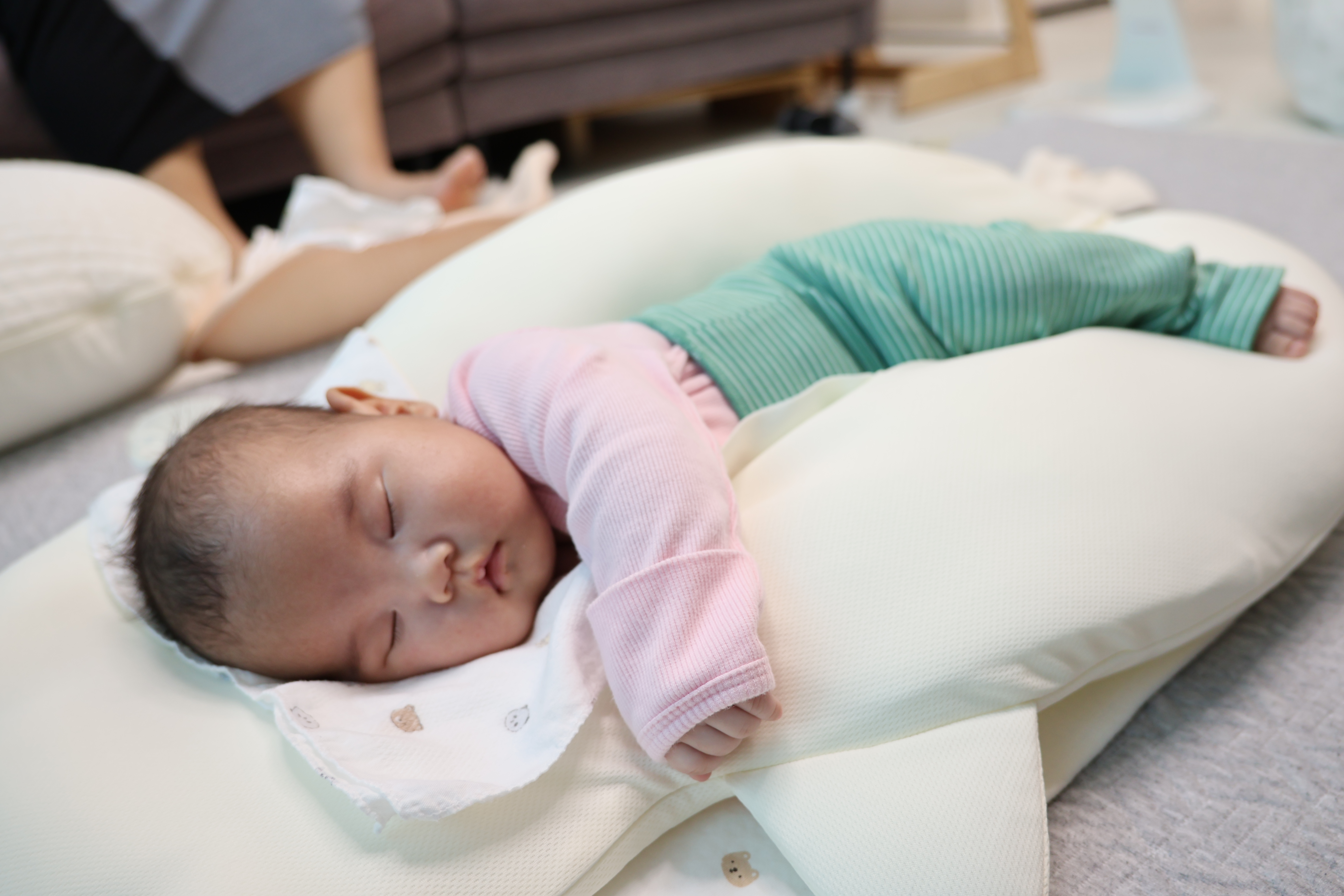 방바닥에 이불을 깔고 그 위에 옆잠배게로 재웠는데 잘 잤다.