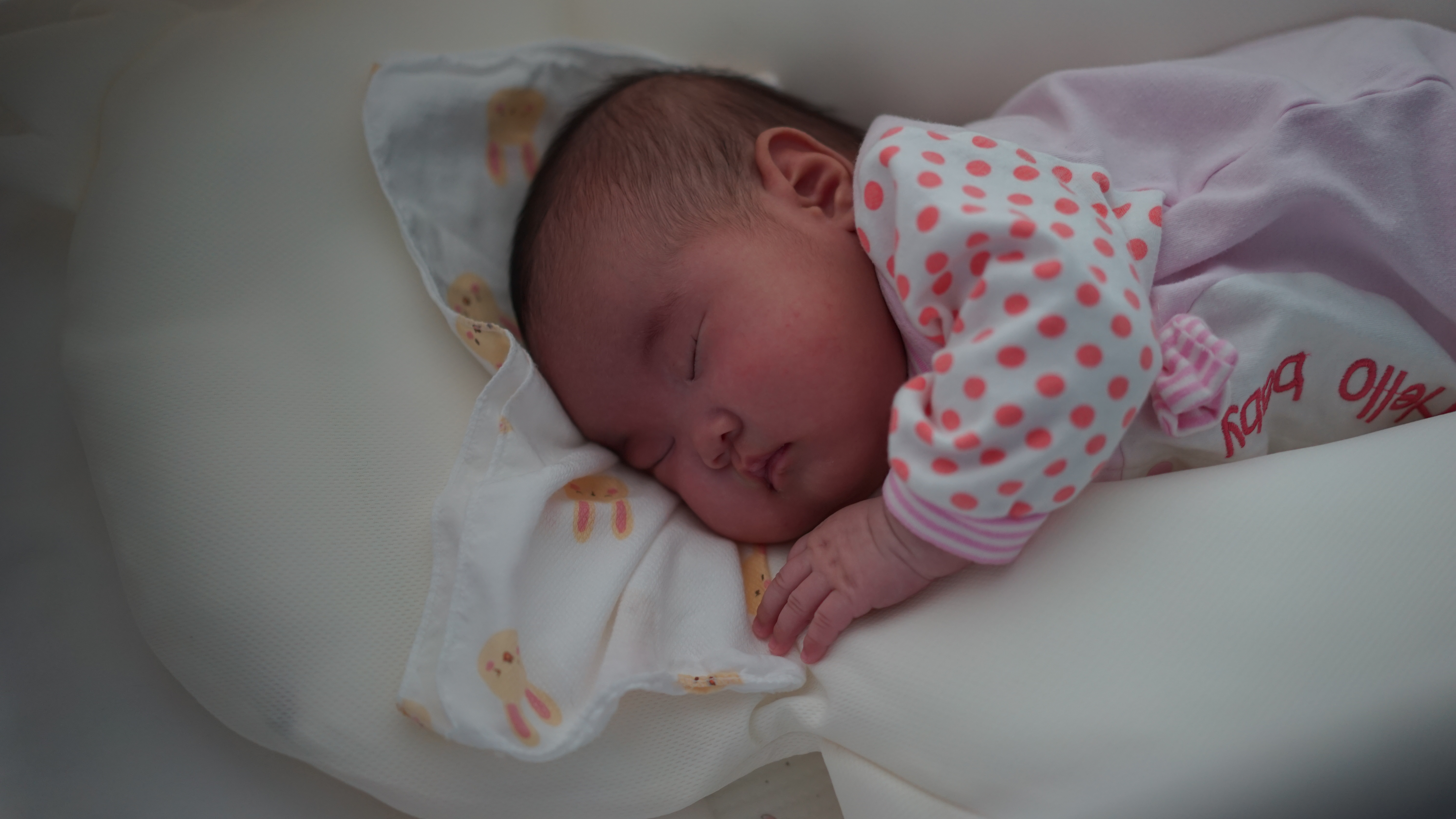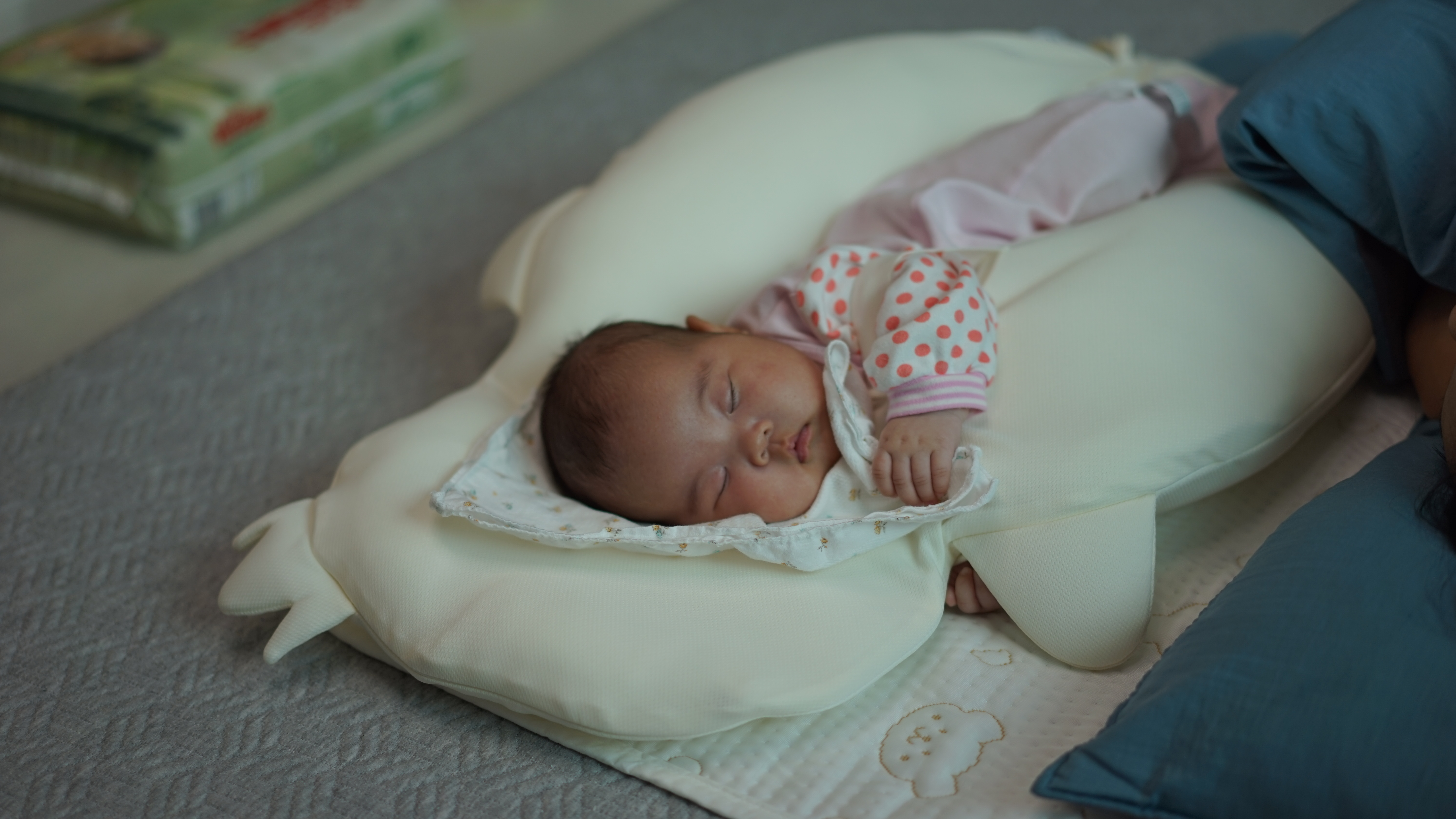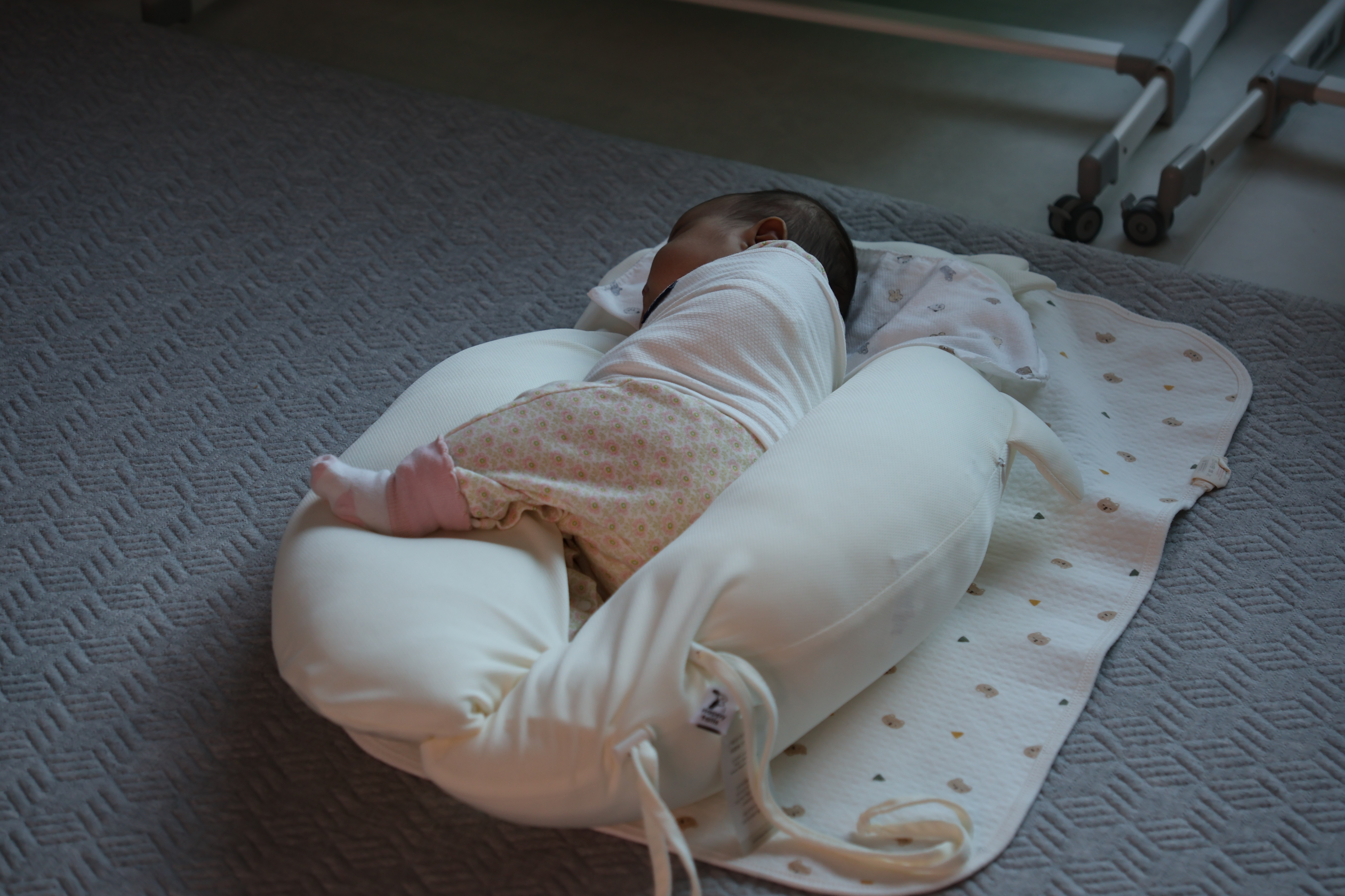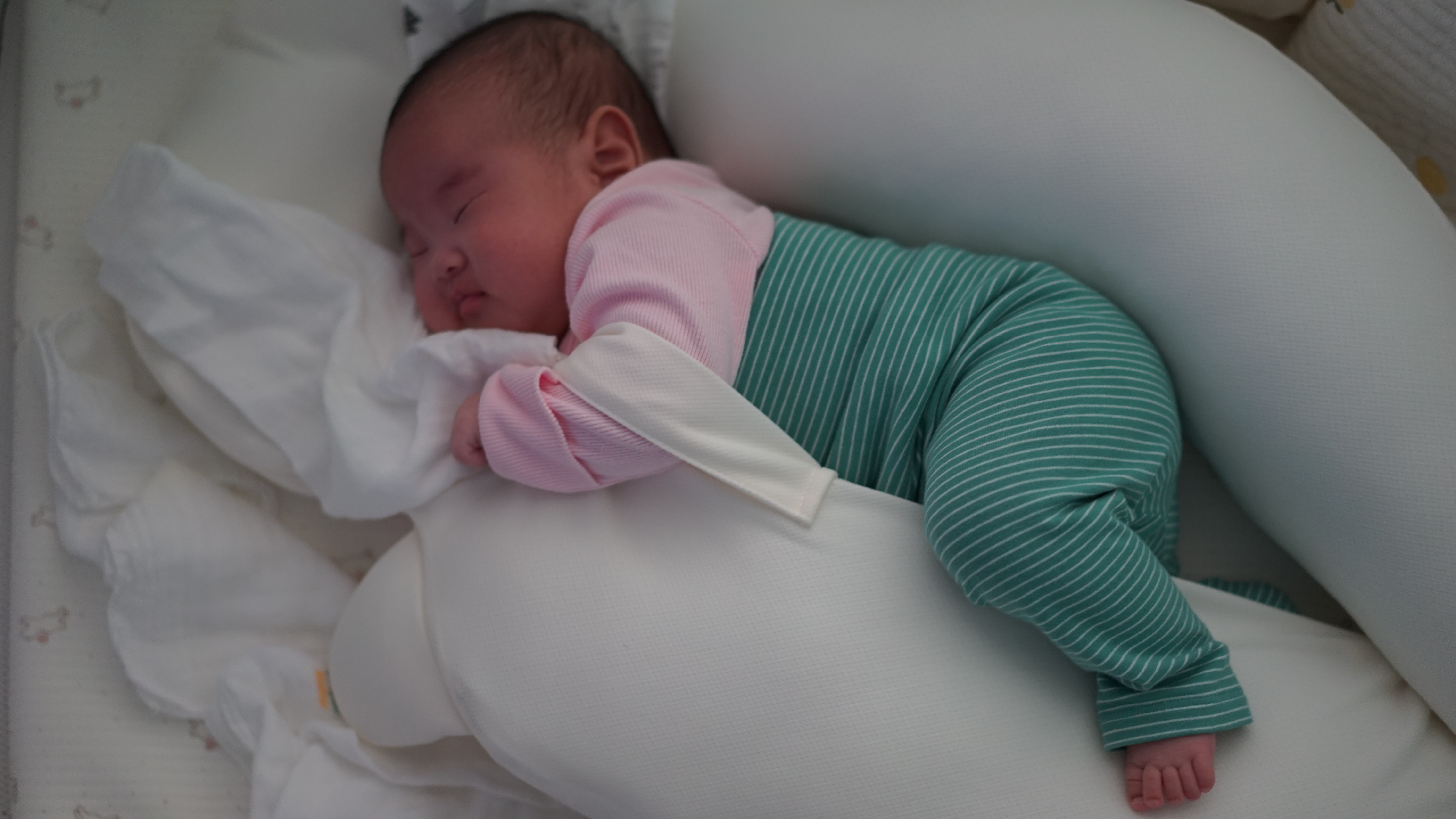 방바닥에 이불을 깔고 그 위에 옆잠배게로 재웠는데 잘 잤다.