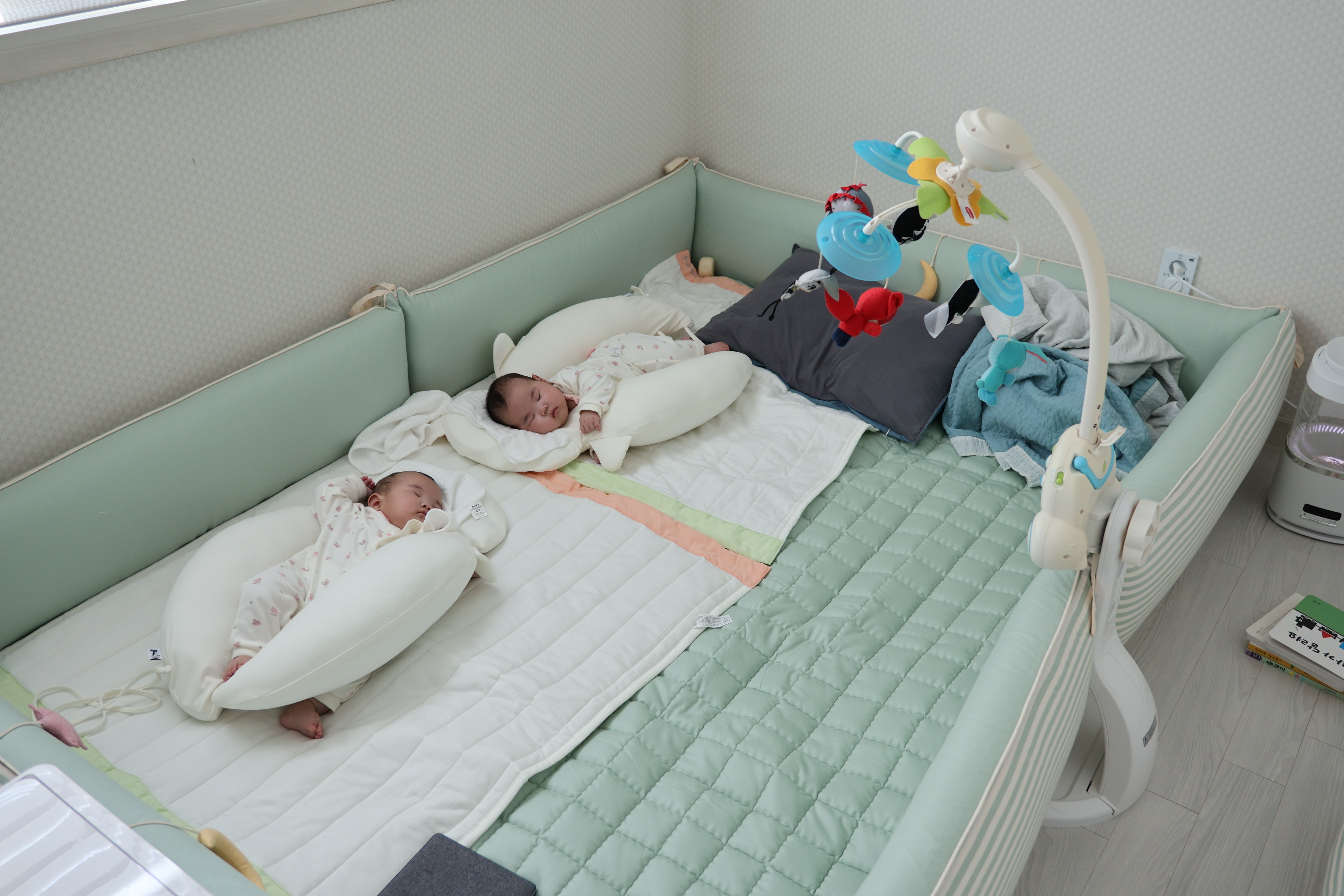 휑한 침대에 눞히니까 아기도 우리도 당황했달까.