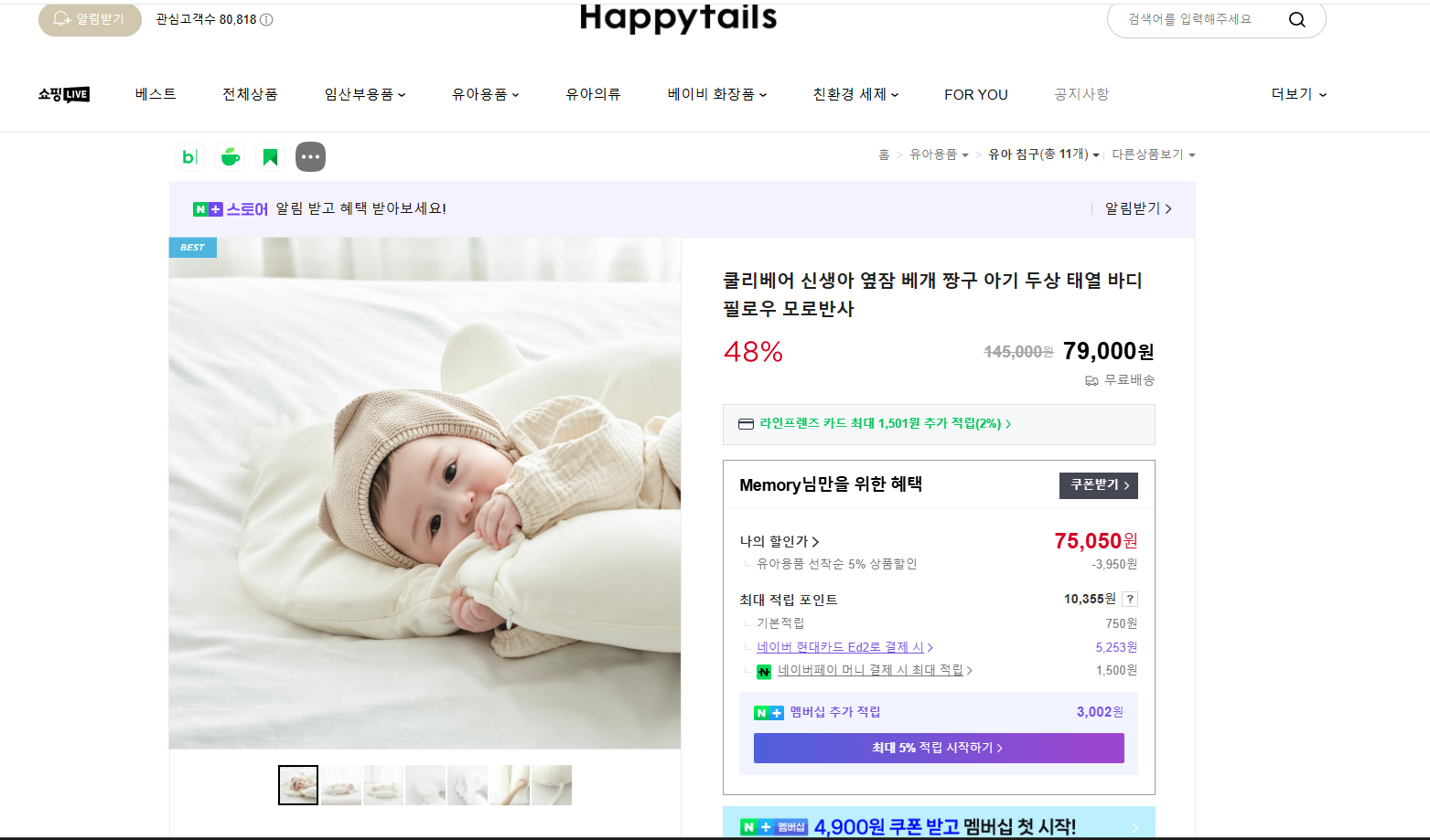 네이버에서 검색하면 해피테일즈 옆잠배게는 79,000원에 구매할 수 있다.