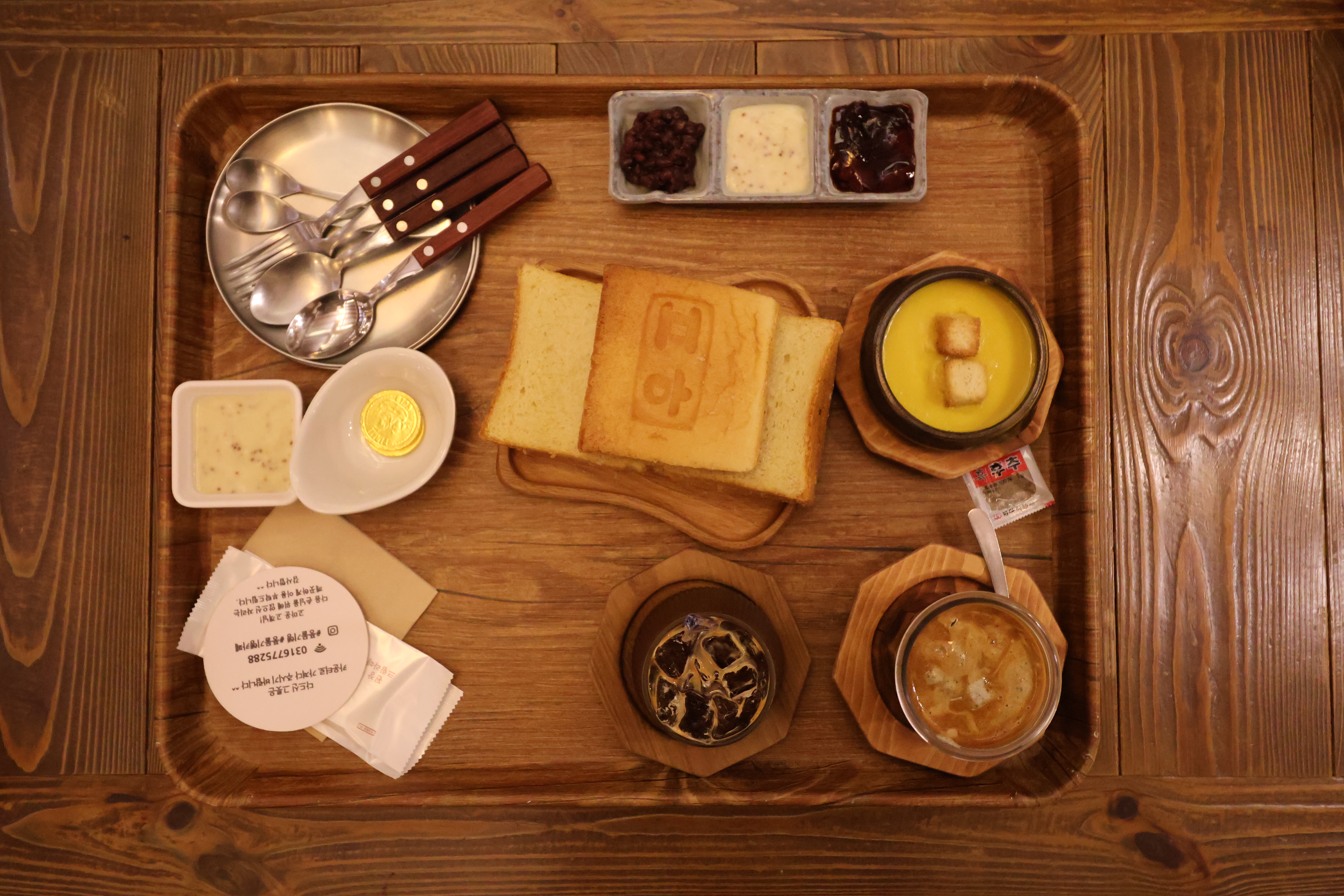 기본 식빵과 그 소스, 단호박스프, 아이스 아메리카노, 된장라떼, 서비스로 주는 동전 초콜릿이다.