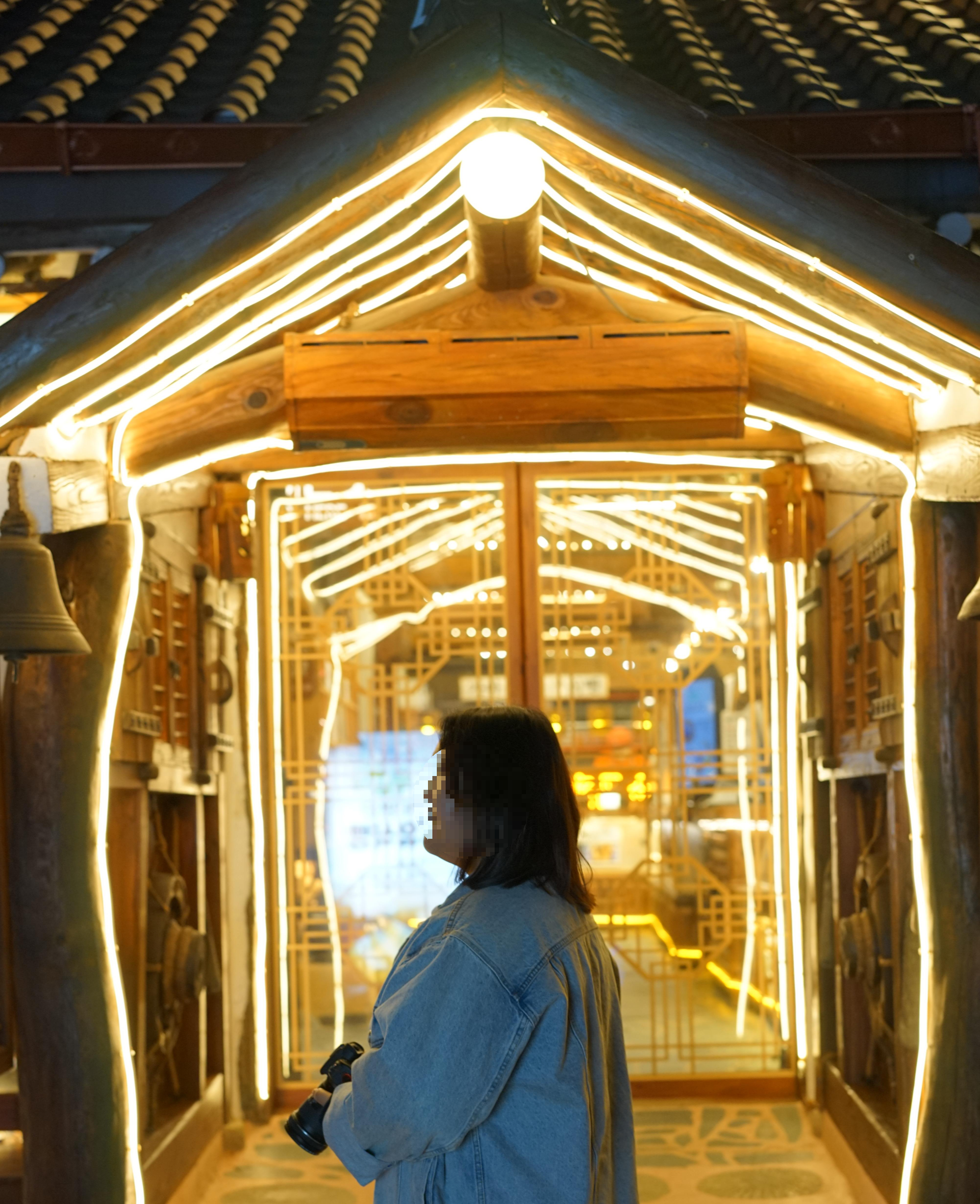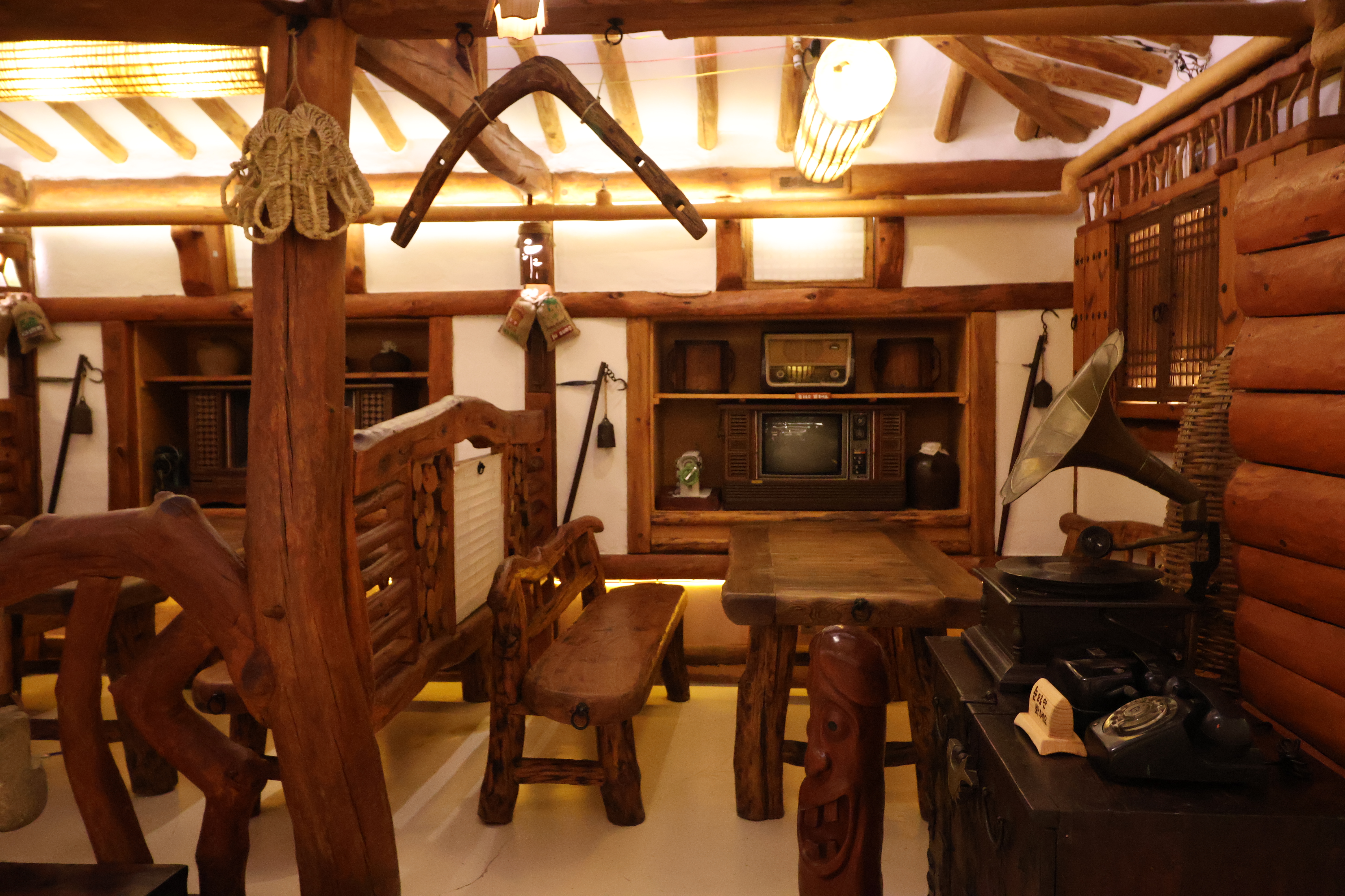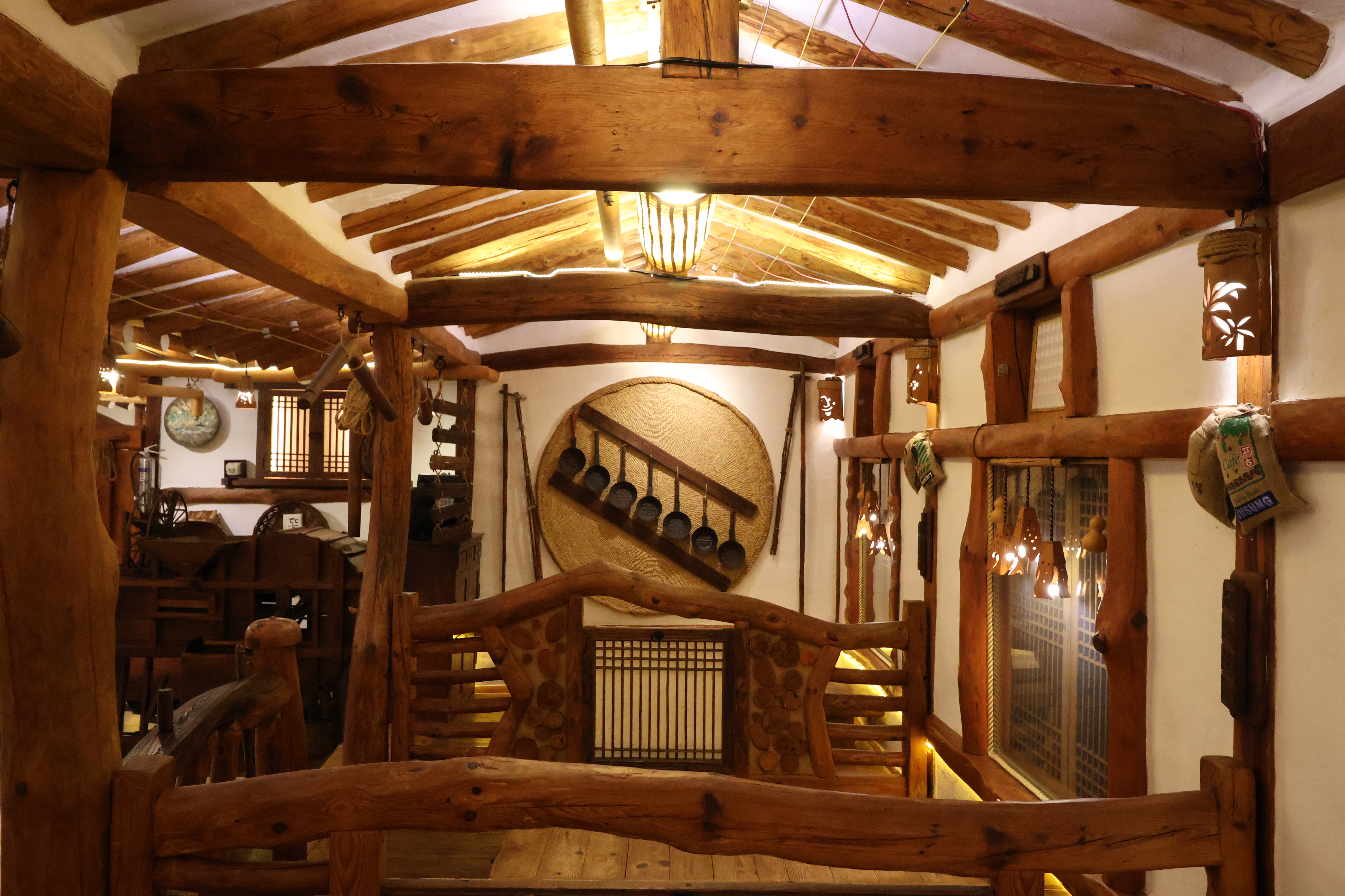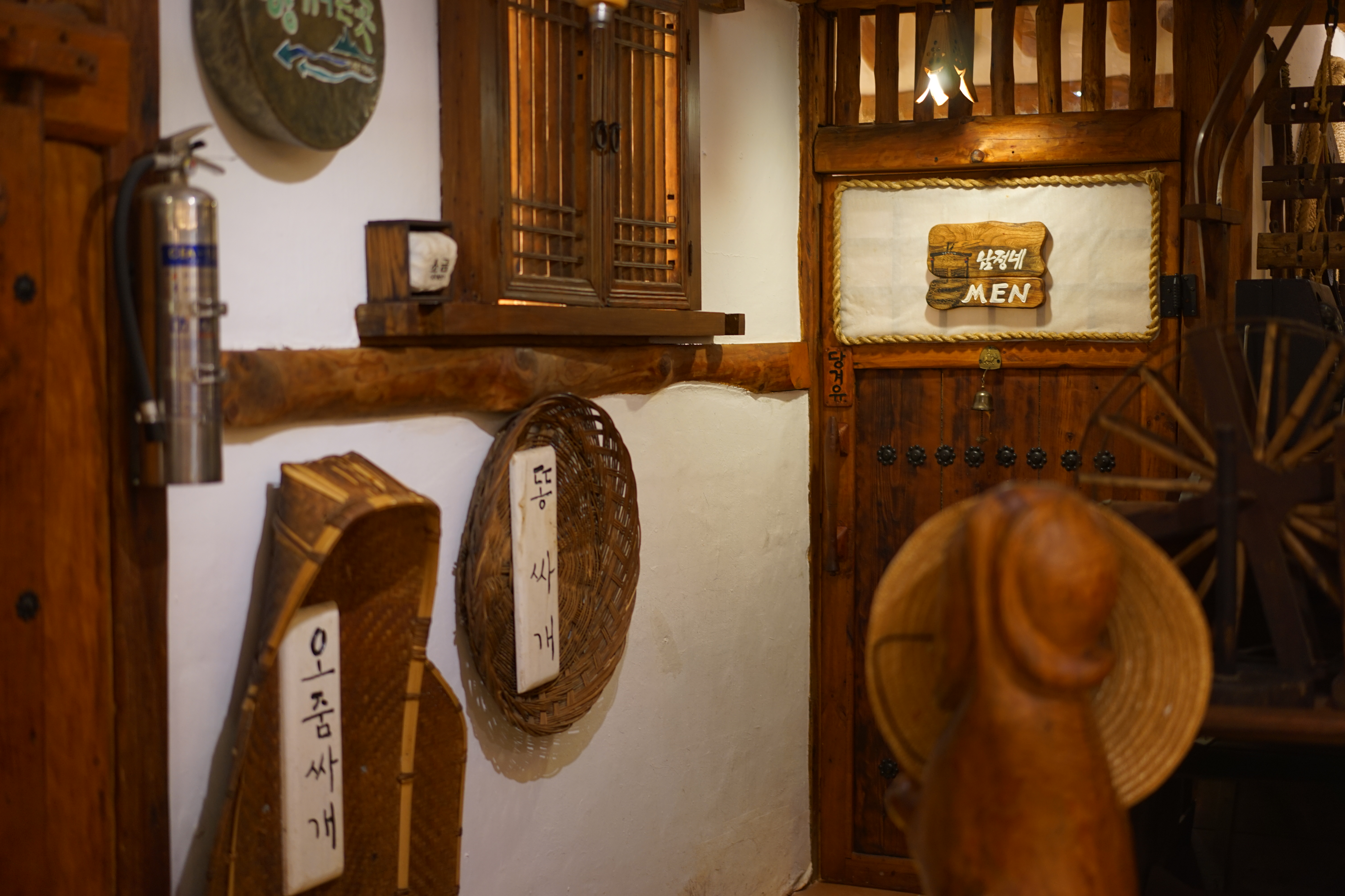 기둥에 걸린 짚신, 조명 모양, 좌식 자리에 놓여있는 신발 놓는 돌 받침 등