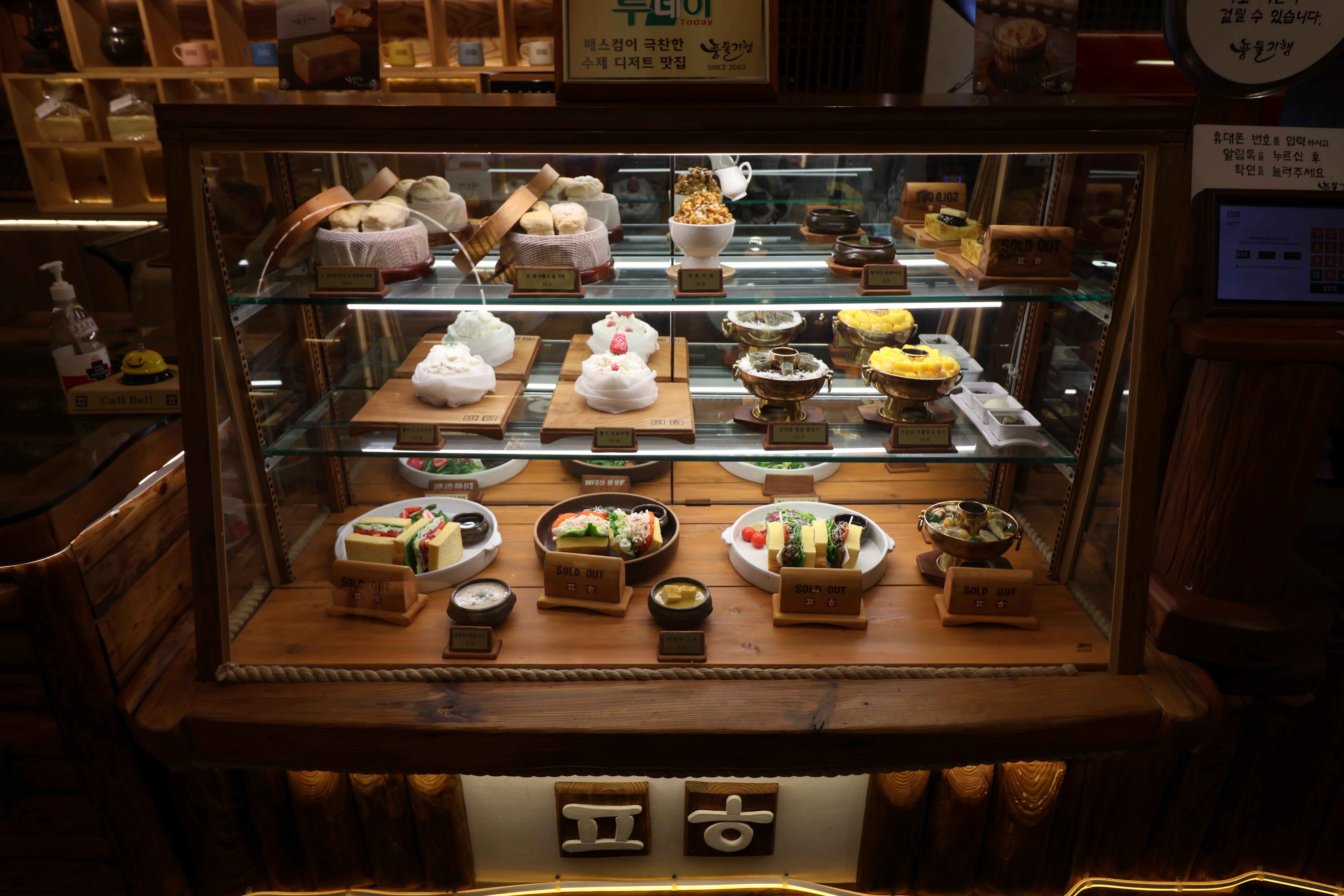 카운터 옆에 보면 팥빙수, 케잌 등 디저트와 샌드위치 메뉴 샘플이 진열되어 있다.