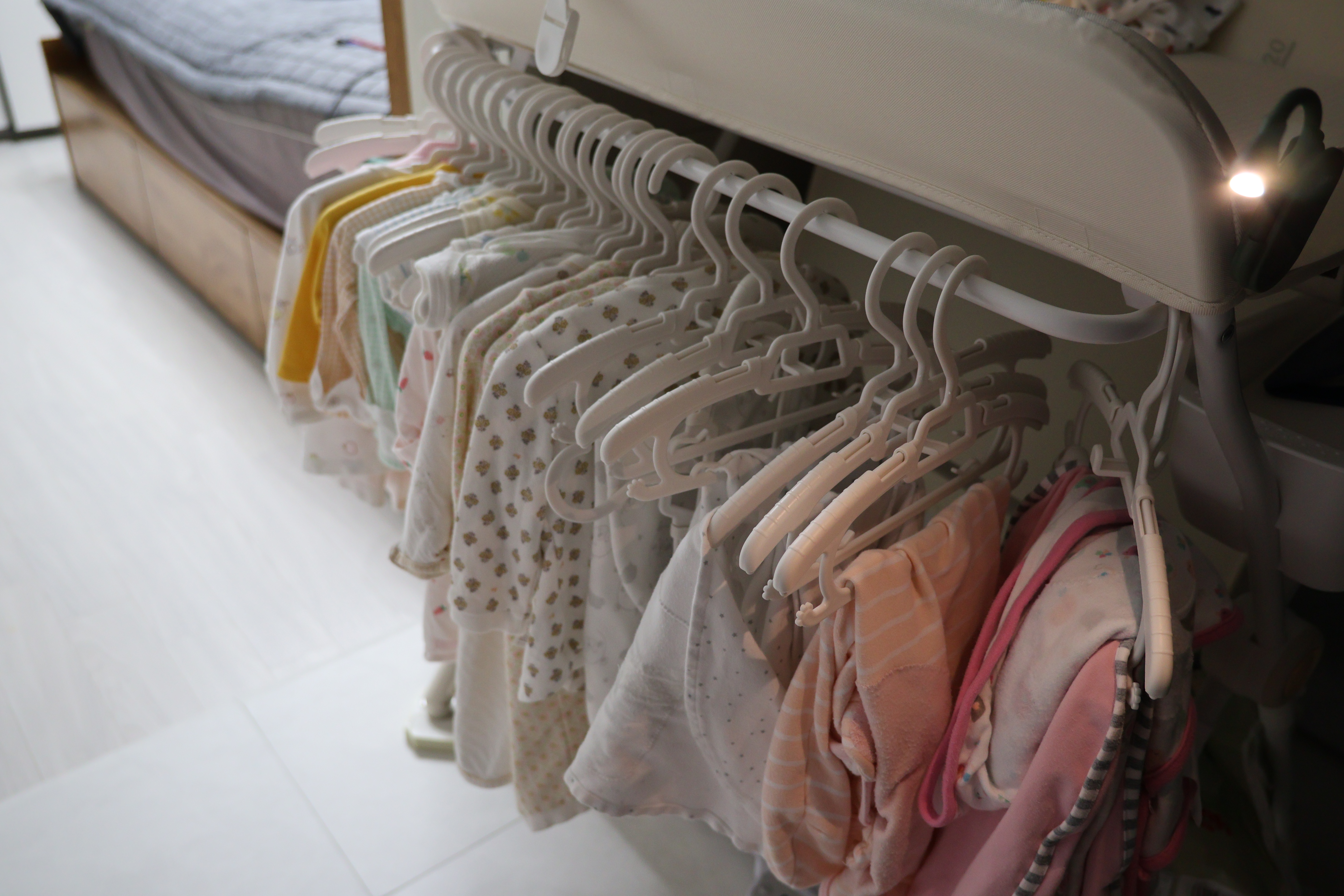 왼편에는 옷걸이로 아기 옷을 쭉 걸어두었다.
