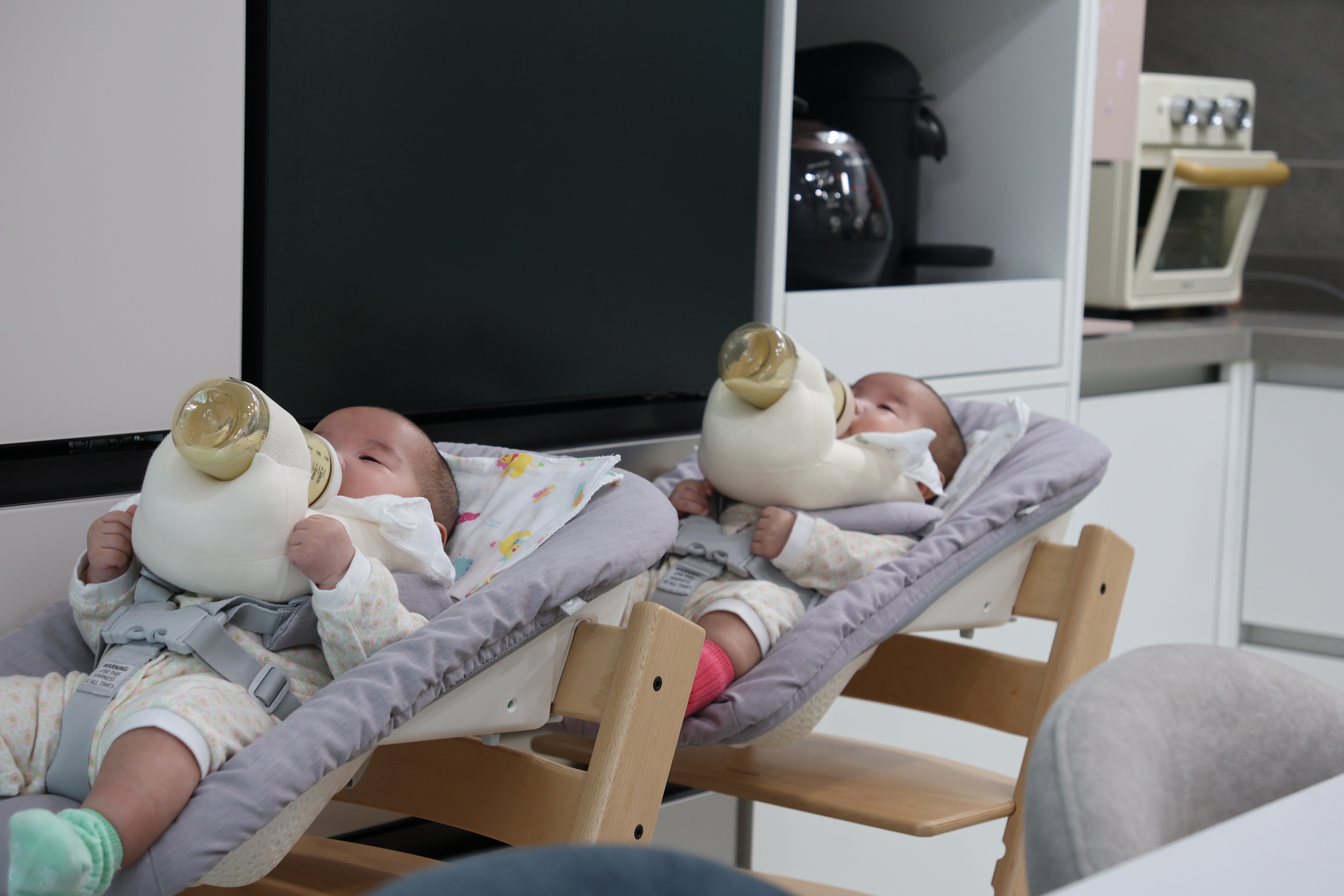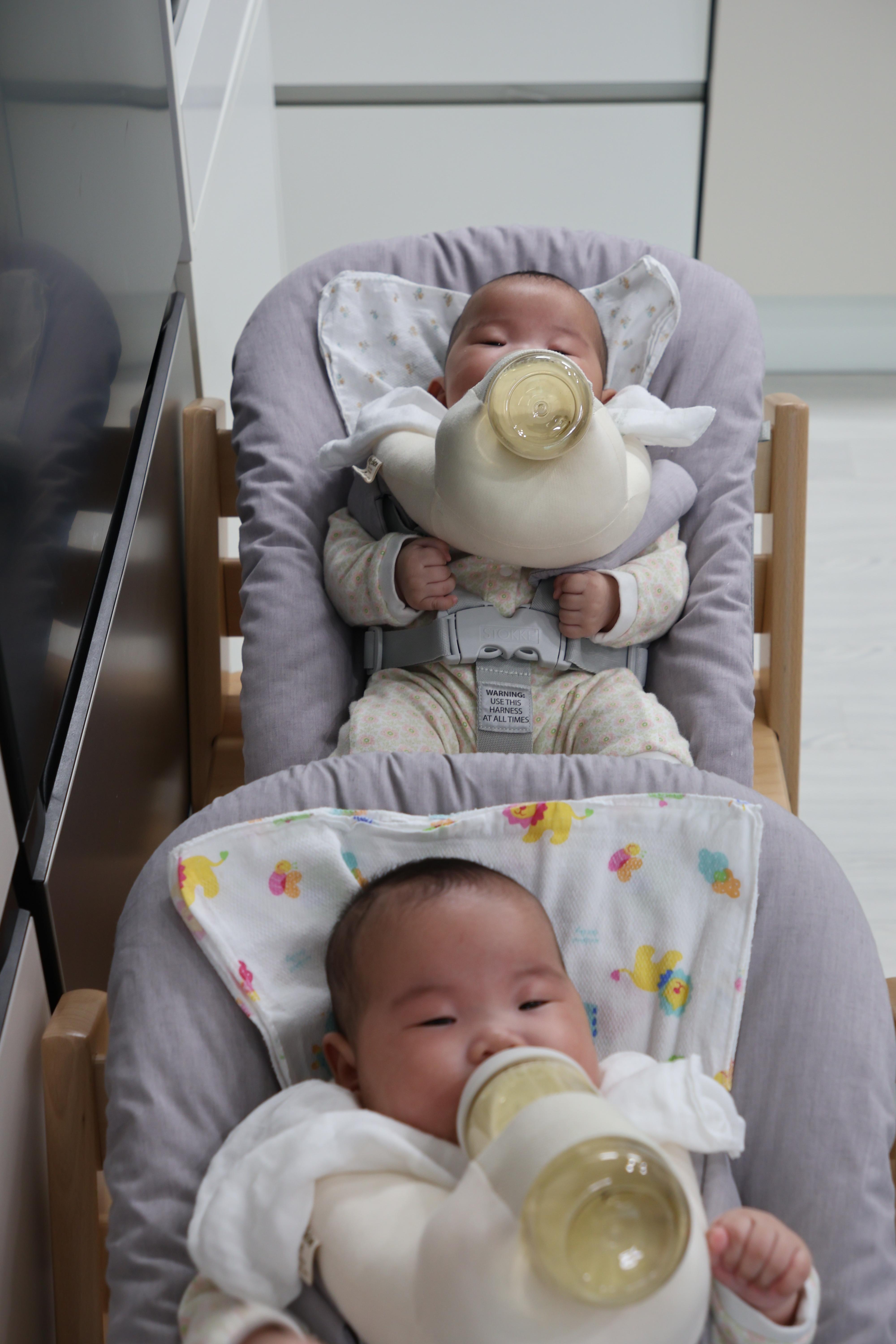 아기를 잠시 눕히거나, 양육자가 식사하면서 아이를 돌볼 때, 아기가 좀 더 커서 이유식을 할 때
