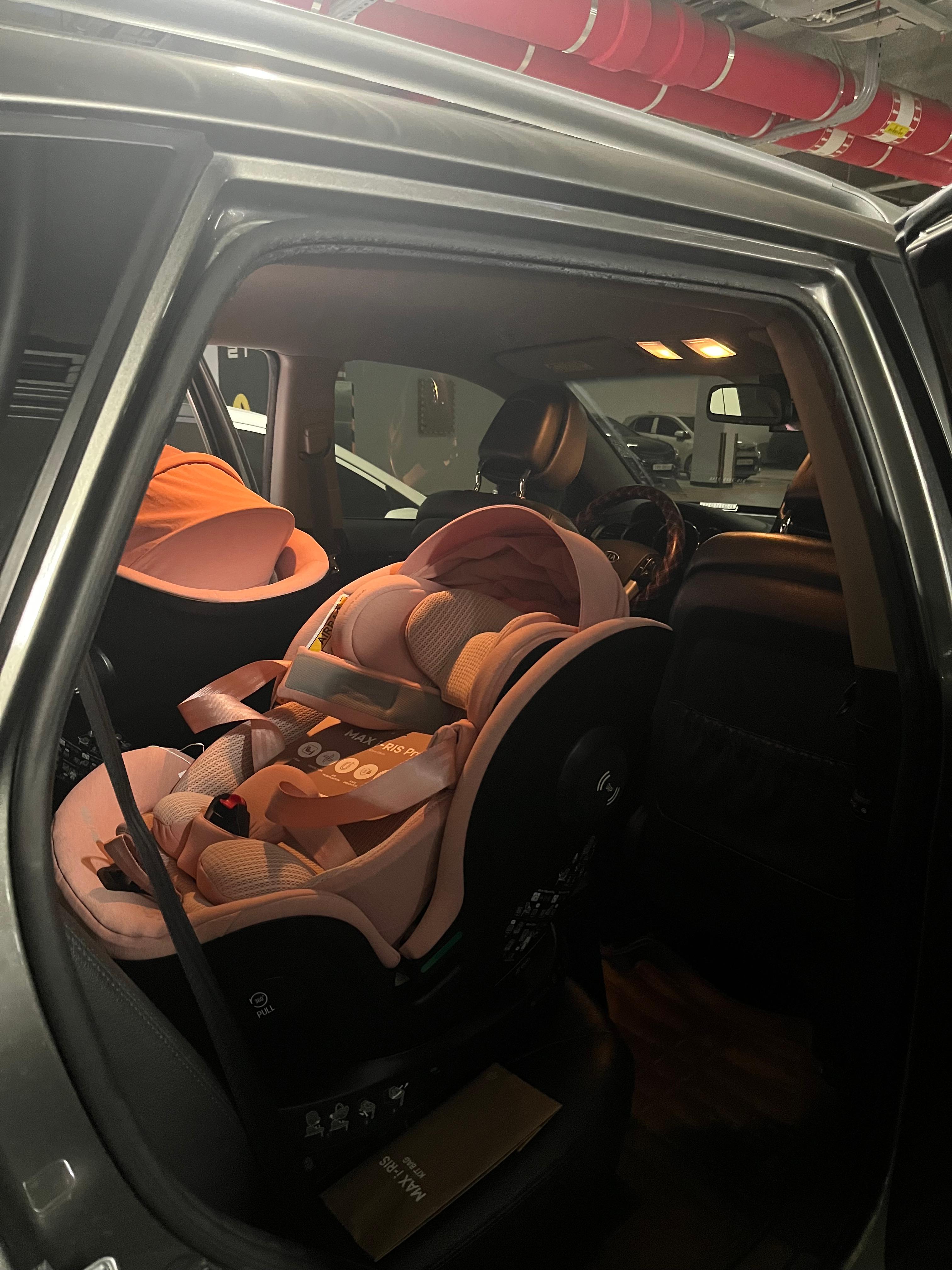 분홍색 카시트 인데 조명이 노란색이다보니 색깔이 분홍색이 아니고 다른 오묘한 색으로 보인다.